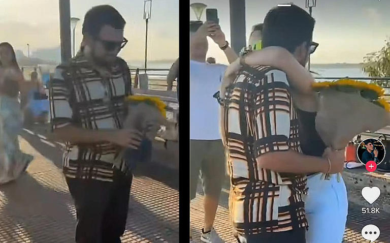 El hombre se paró al lado de la chica con un ramo de flores y le propuso ser novios mientras sonaba de fondo una serenata. Sin embargo, su amiga reaccionó de manera extraña, le dijo que no, lo abrazó y huyó de la situación.