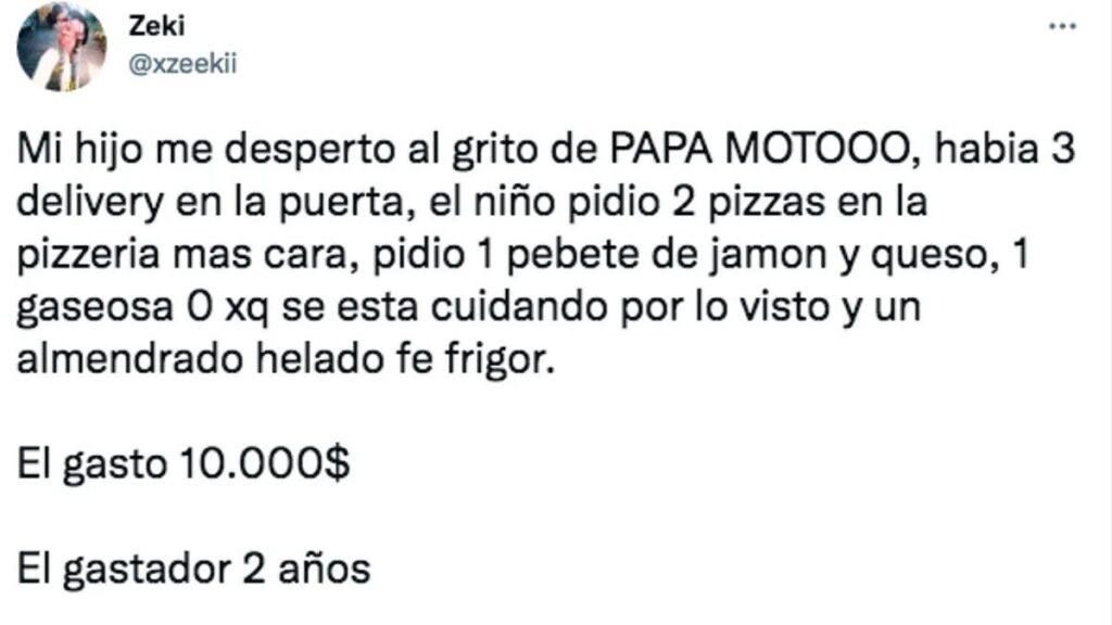 “Mi hijo me despertó al grito de ‘Papá motooo’. Había tres delivery en la puerta. El niño pidió dos pizzas en la pizzería más cara y un pebete de jamón y queso”, declaró el padre.