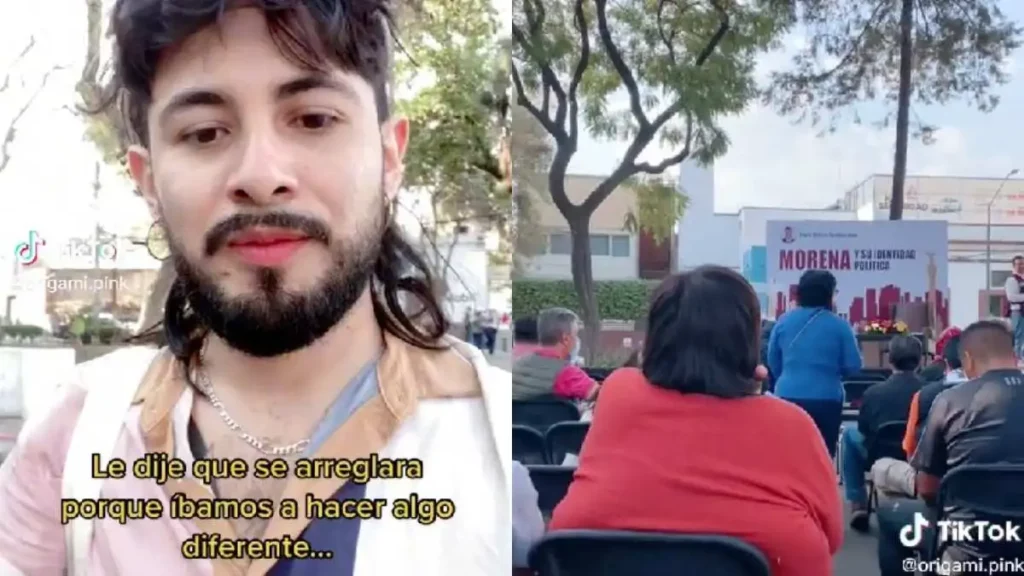 Algunos segundos después, se observa que el joven decidió llevar a su pareja a un mitin del partido político Movimiento Regeneración Nacional (Morena).